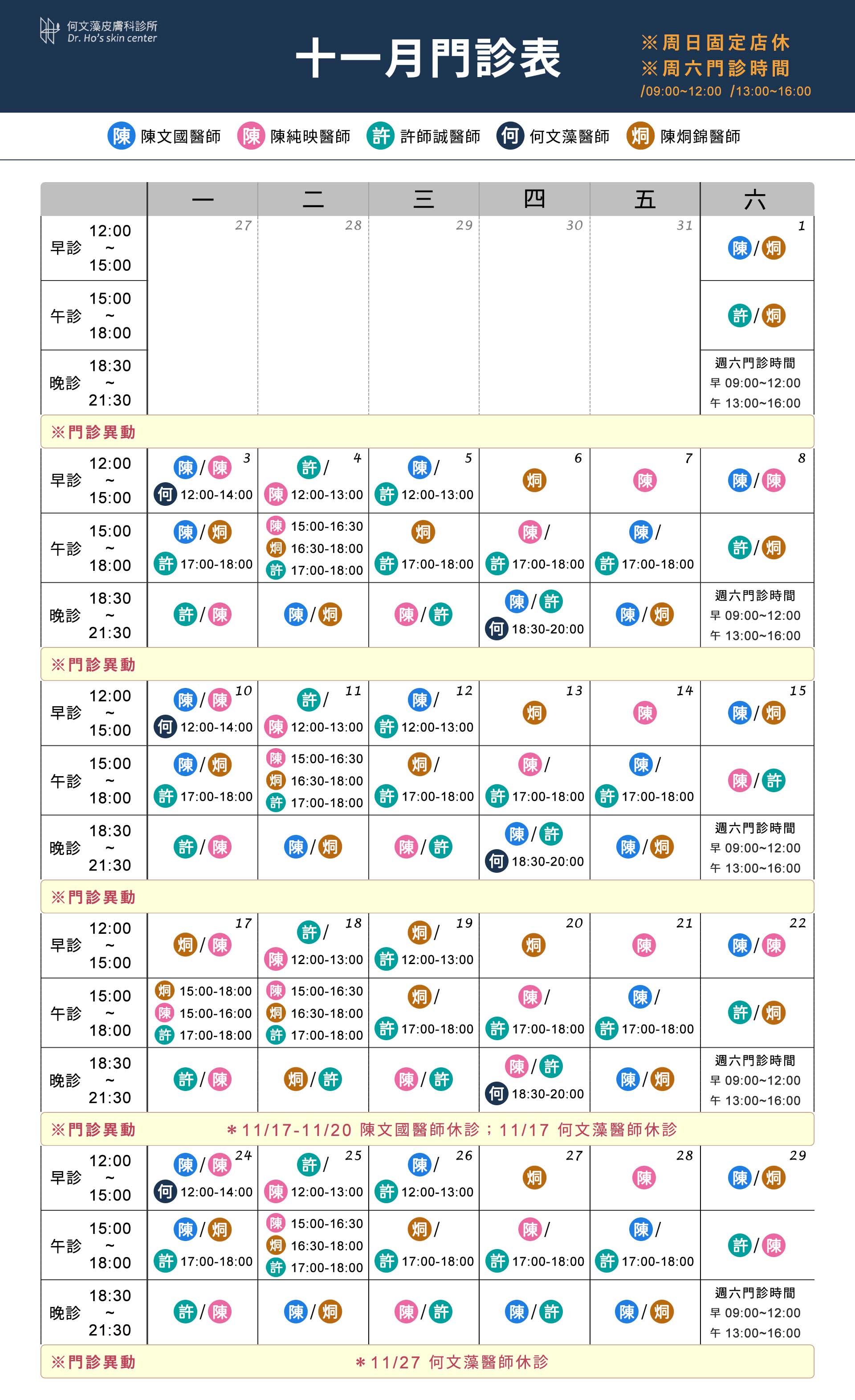 因應疫情,診所的醫師看診表改為每週公佈,會隨著政府的抗疫政策,隨時做變更請留意官網消息,以下為114年11月01號至11月30號診所門診時間 :