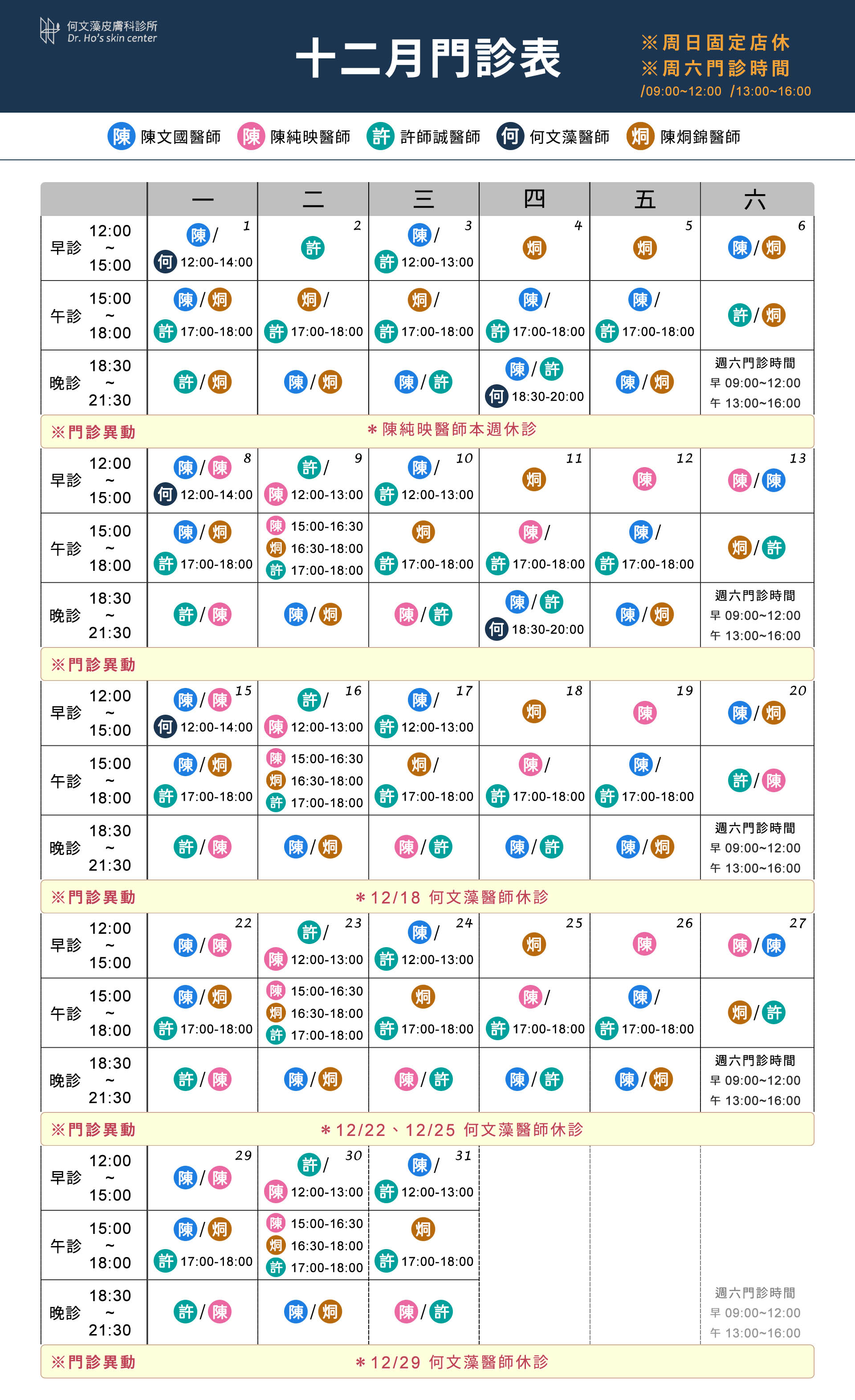 因應疫情,診所的醫師看診表改為每週公佈,會隨著政府的抗疫政策,隨時做變更請留意官網消息,以下為114年11月01號至11月30號診所門診時間 :